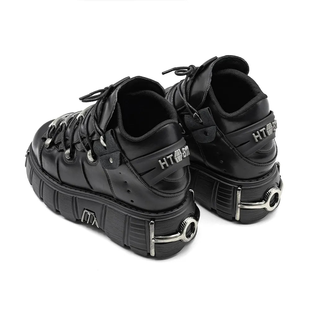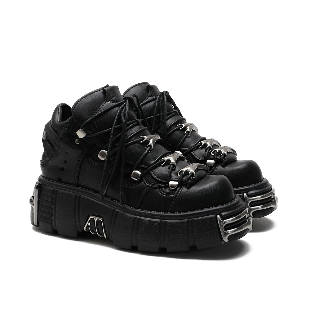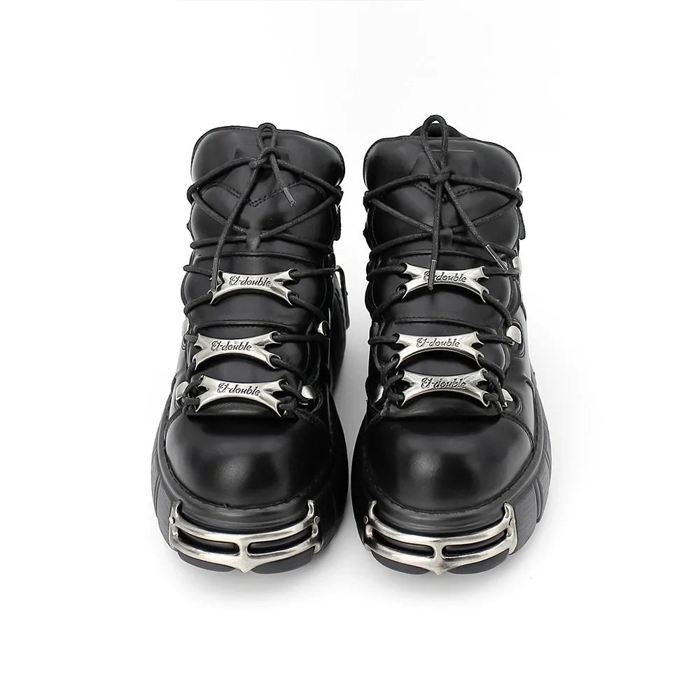 - Caractéristiques : design robuste et imposant, semelle sculptée avec éléments métalliques signature, parfait pour un look goth industriel ou alternatif