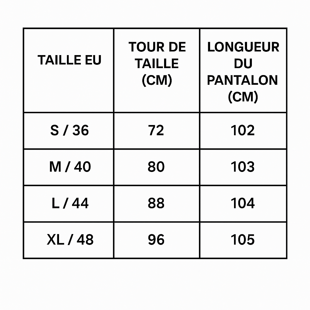 - Longueur : Longue (pantalon couvrant les chaussures)
