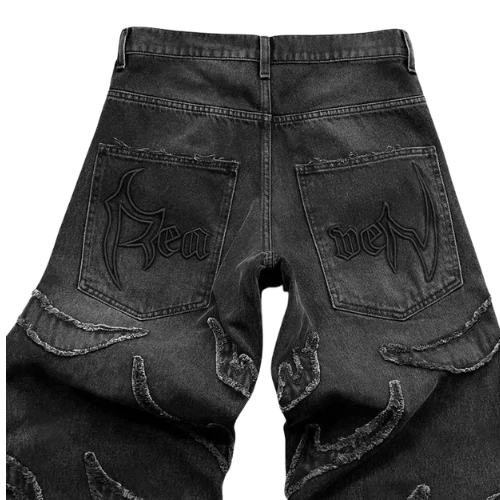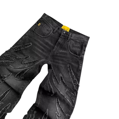 - Décoration : effets usés, déchirures contrôlées, broderies ou appliqués sur les jambes et poches arrière