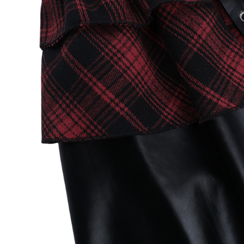 - Jupe : asymétrique, superposition de tissu à carreaux et de tissu noir satiné