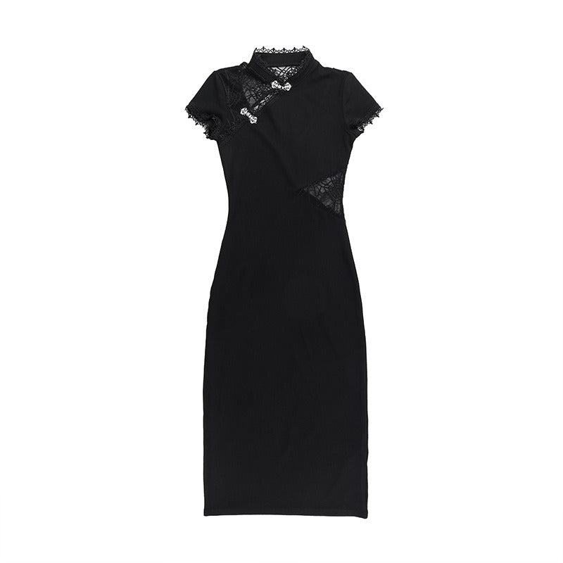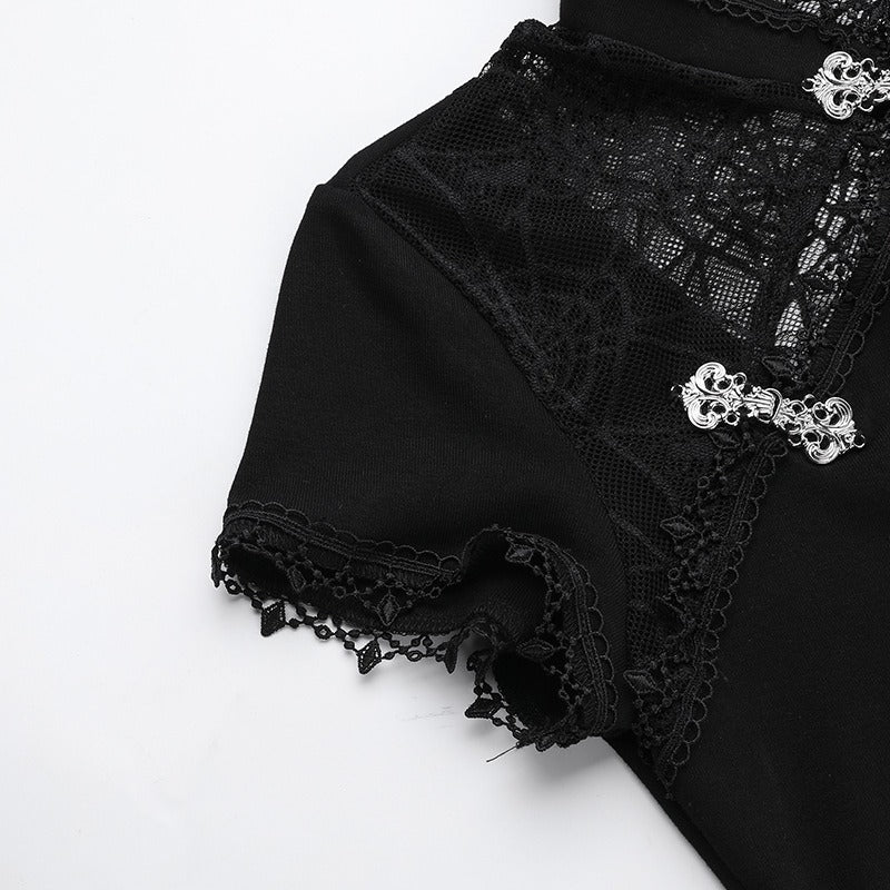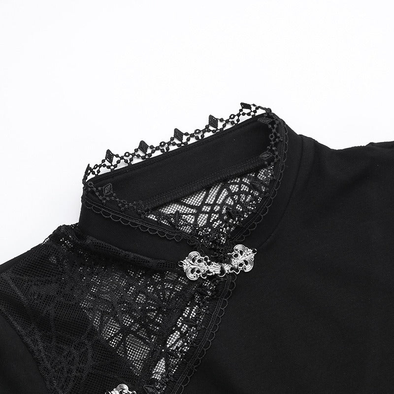 - Haut : col montant de style qipao avec fermoirs traditionnels “grenouille” argentés et découpes diagonales en dentelle transparente