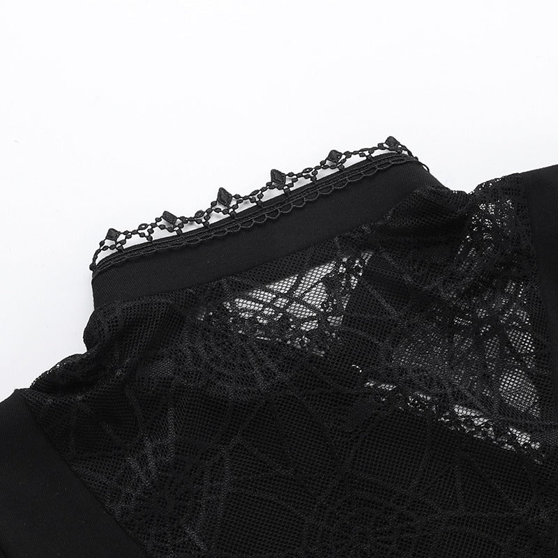 - Détails : bordures en dentelle fine au col et aux manches, empiècements asymétriques en dentelle, fermeture zippée discrète au dos