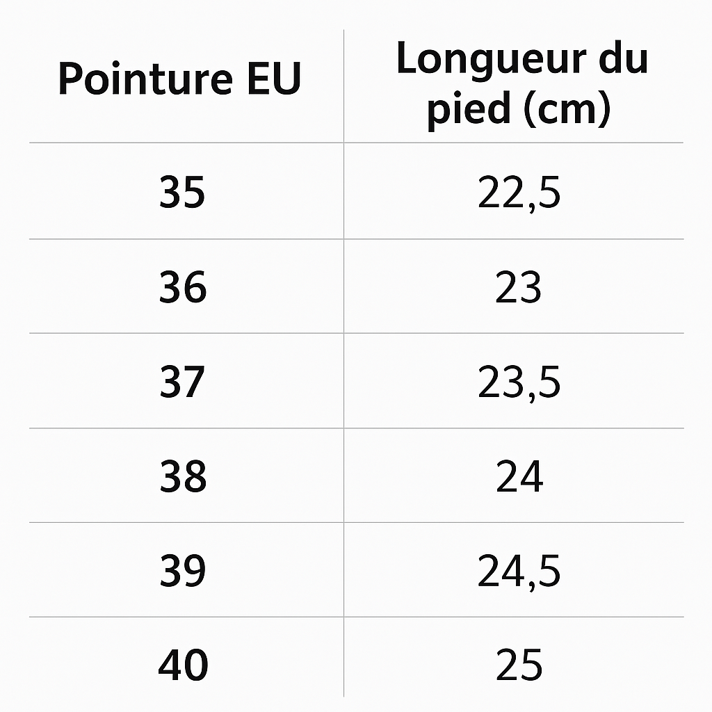 - Semelle intérieure : légèrement rembourrée pour le confort